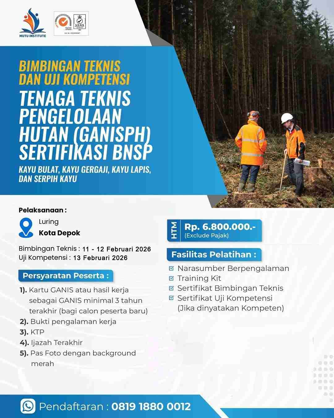 Mutu Institute menyelenggarakan Bimbingan Teknis dan Uji Kompetensi Tenaga Teknis Pengelolaan Hutan (GANISPH) tersertifikasi BNSP pada 11–13 Februari 2026 di Kota Depok. Program ini merupakan solusi bagi profesional di industri kayu bulat, kayu gergaji, kayu lapis, dan serpih kayu untuk mendapatkan pengakuan kompetensi resmi negara. Melalui pelatihan ini, peserta akan dibekali keahlian teknis sesuai standar skema sertifikasi terbaru guna mendukung tata kelola kehutanan yang berkelanjutan.