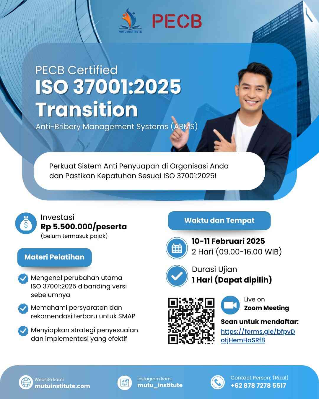 Mutu Institute menghadirkan pelatihan transisi ISO 37001:2025 PECB Certified untuk memperkuat Sistem Manajemen Anti Penyuapan (SMAP) organisasi Anda sesuai standar global terbaru. Melalui program intensif pada 10-11 Februari 2025, peserta akan dibekali strategi penyesuaian dokumen dan implementasi kendali anti-suap yang efektif. Segera daftarkan diri Anda untuk memastikan kepatuhan korporasi terhadap pembaruan regulasi internasional.