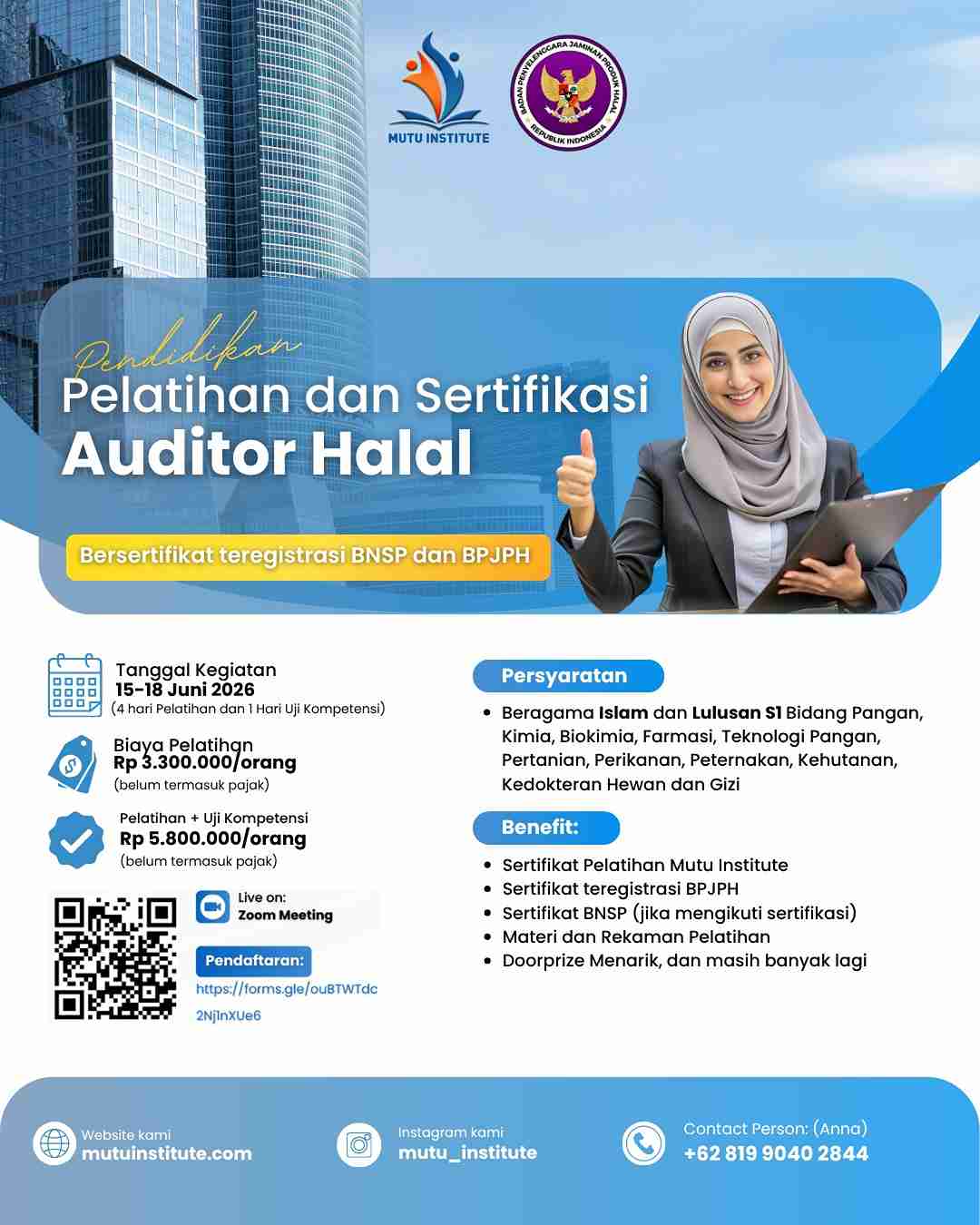 Pelatihan Auditor Halal adalah program pendidikan intensif yang dirancang untuk mencetak tenaga ahli dalam pemeriksaan dan verifikasi kehalalan produk sesuai regulasi Jaminan Produk Halal di Indonesia. Mutu Institute menyelenggarakan program ini pada 15–18 Juni 2026 (4 hari pelatihan dan 1 hari uji kompetensi) secara daring melalui Zoom Meeting. Program ini memberikan validasi resmi bagi para profesional melalui sertifikat yang teregistrasi di BPJPH dan BNSP, guna memastikan standar integritas produk halal di pasar nasional maupun global tetap terjaga.