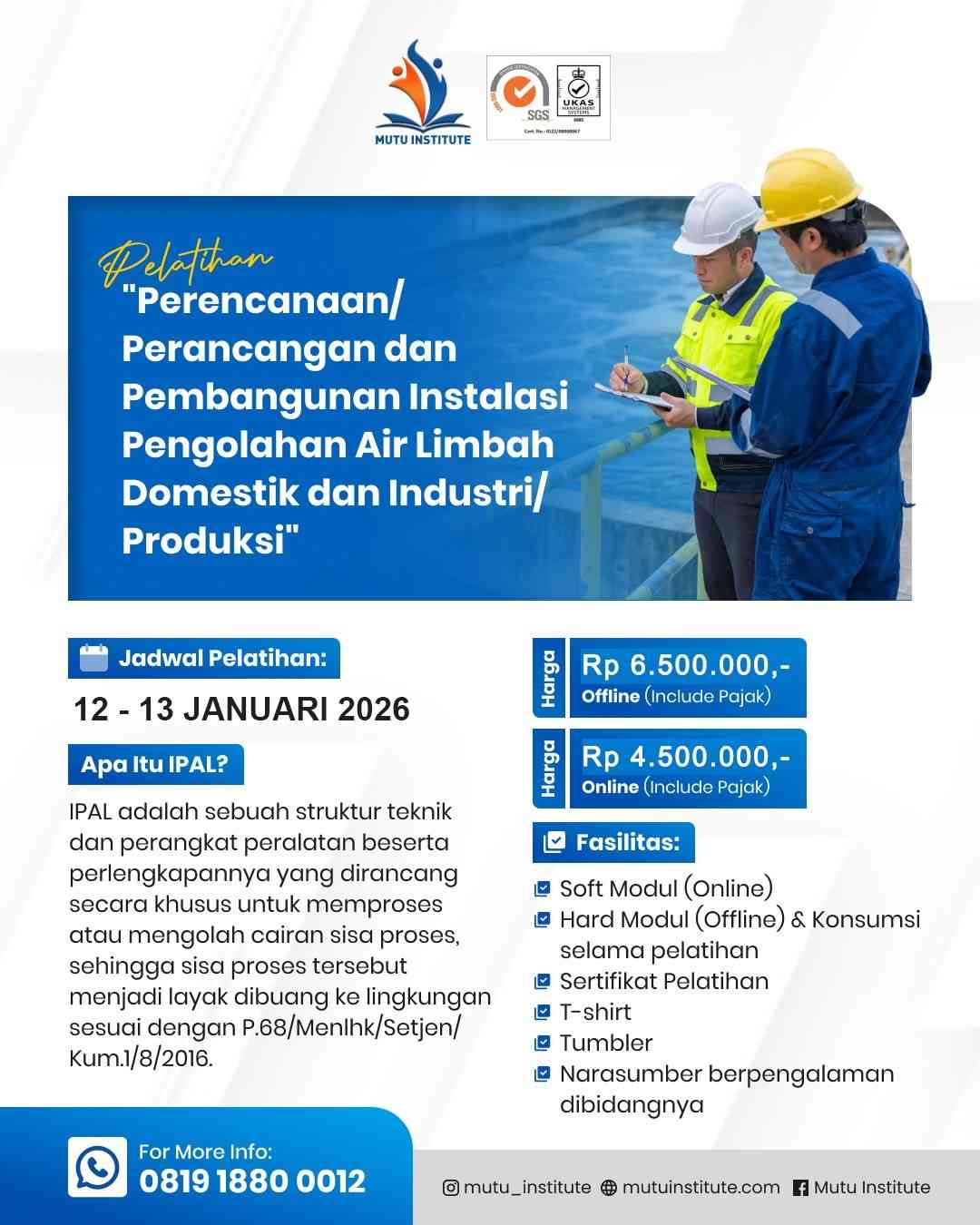 Ayo Ikuti Pelatihan IPAL Domestik dan Industri/Produksi by Mutu Institute yang akan dilaksanakan pada :