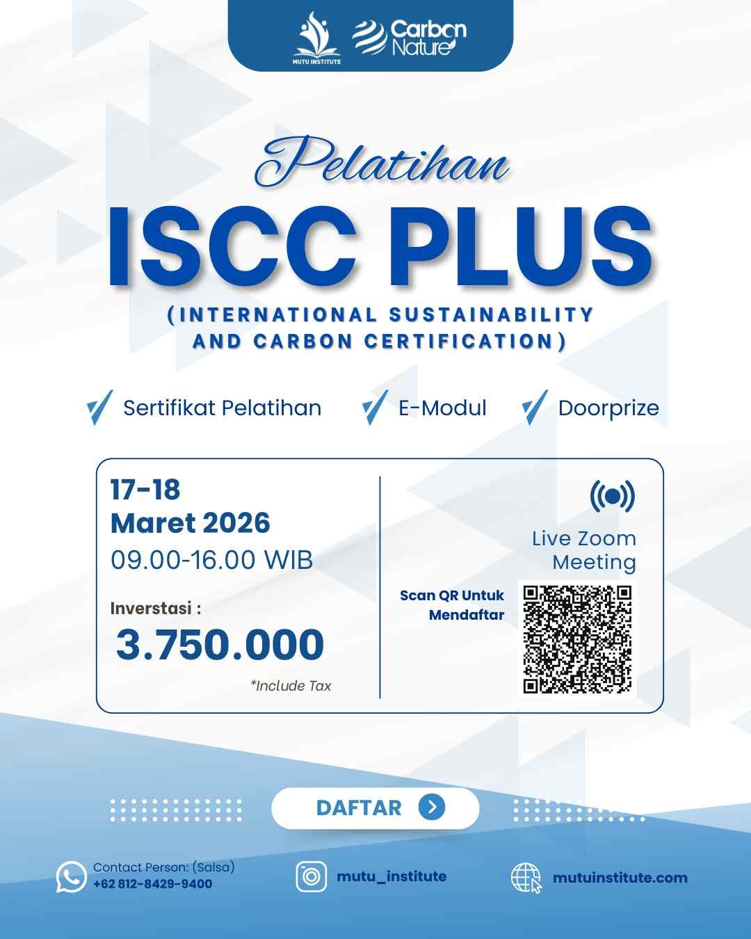 Mutu Institute menyelenggarakan Pelatihan ISCC PLUS pada 17-18 Maret 2026 untuk memberikan pemahaman komprehensif mengenai sistem sertifikasi keberlanjutan dan karbon di pasar internasional. Pelatihan akan dilaksanakan secara daring melalui Live Zoom Meeting dengan materi yang relevan bagi industri kimia, plastik, makanan, hingga energi terbarukan.