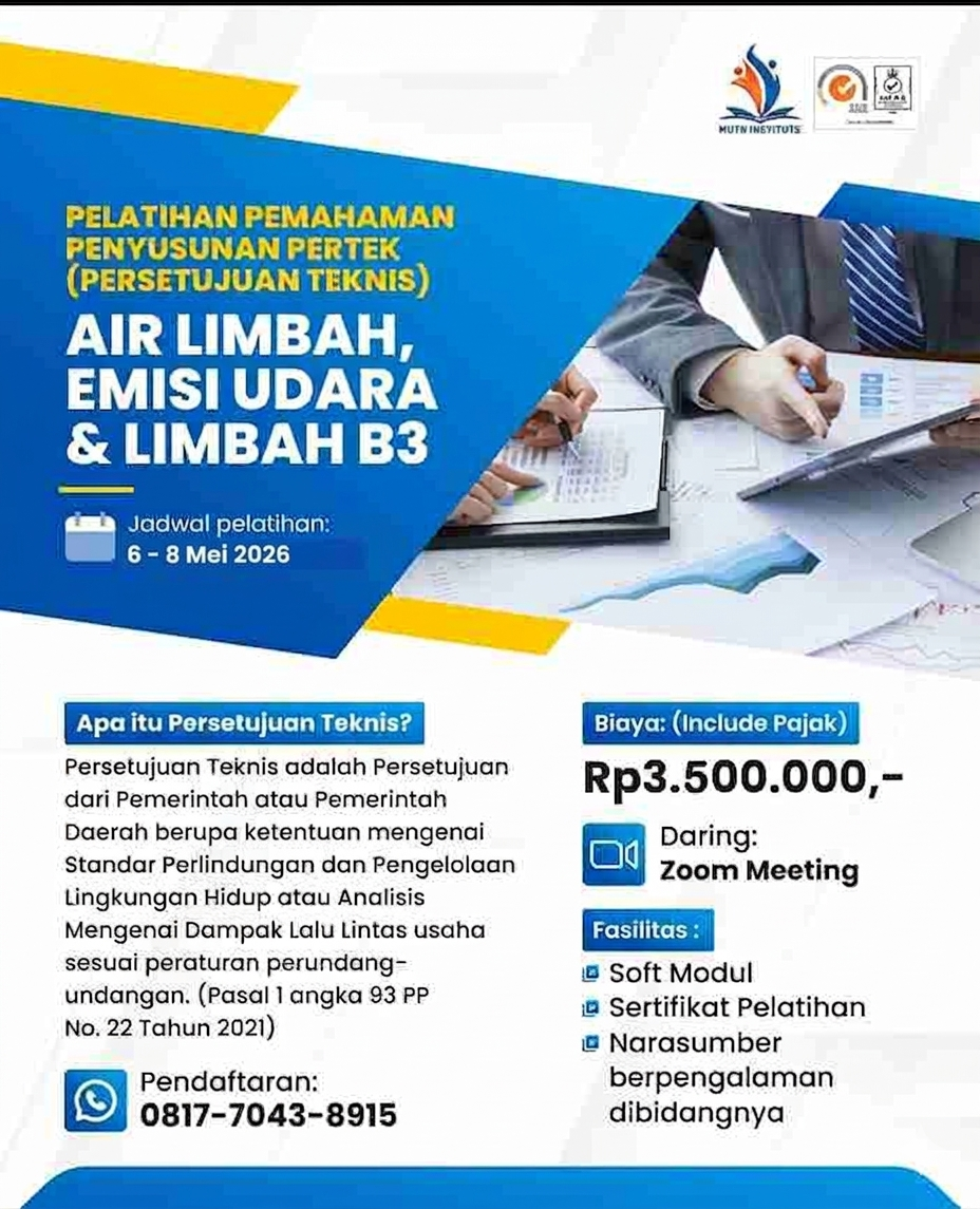 Pelatihan Penyusunan Pertek merupakan instrumen wajib bagi pelaku usaha untuk memastikan standar perlindungan lingkungan hidup terpenuhi sesuai regulasi pemerintah. Mutu Institute menyelenggarakan Pelatihan Pemahaman Penyusunan Pertek yang mencakup aspek Air Limbah, Emisi Udara, dan Limbah B3. Pelatihan ini dirancang untuk membekali profesional lingkungan dengan pengetahuan mendalam mengenai kepatuhan terhadap Pasal 1 angka 93 PP No. 22 Tahun 2021.