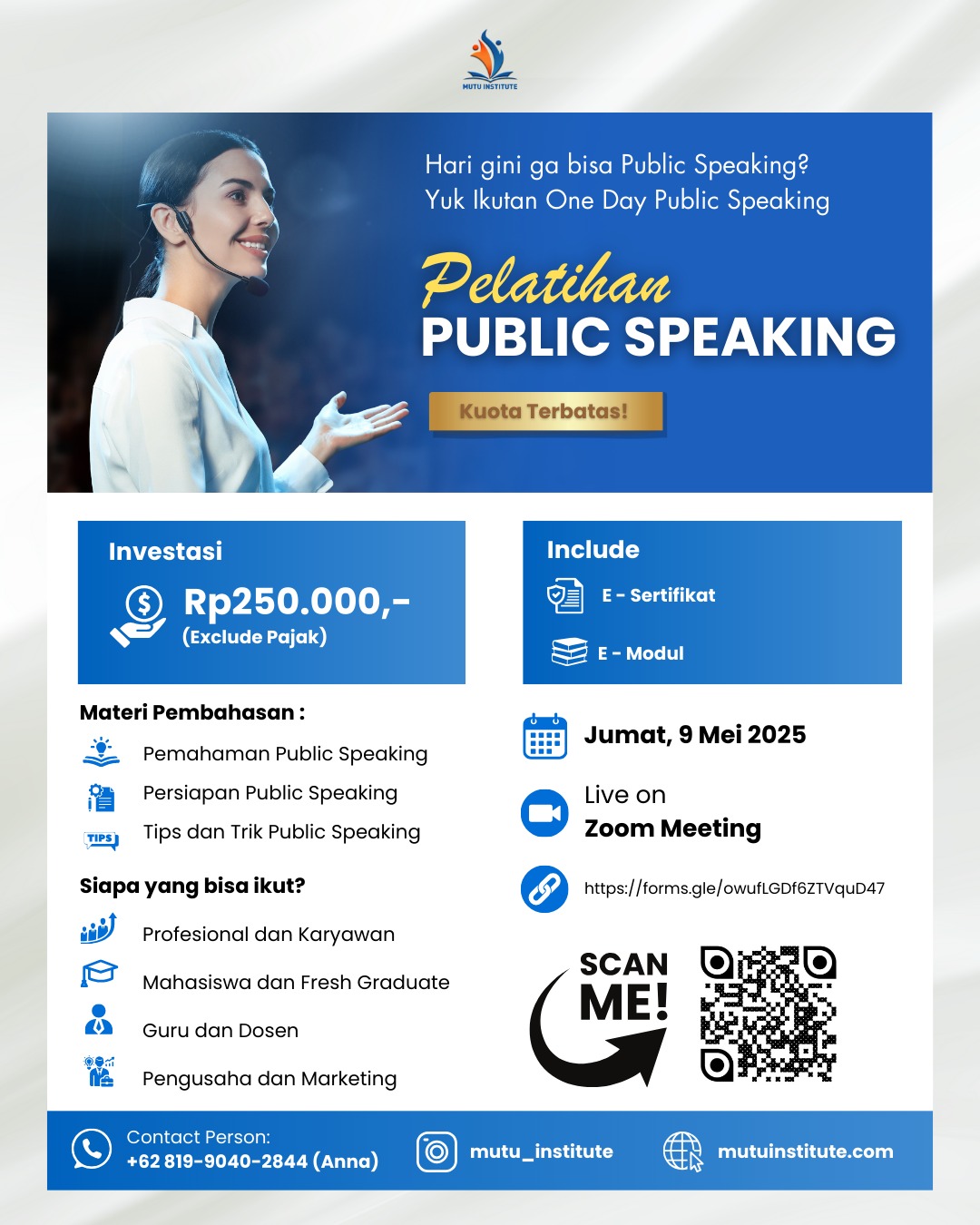Ayo Ikuti pelatihan Public Speaking by Mutu Institute yang akan dilaksanakan pada :