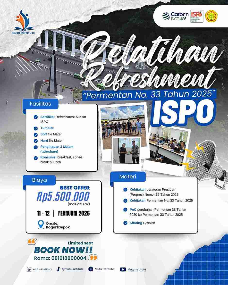Pelatihan Refreshment ISPO adalah program pembaruan kompetensi wajib bagi auditor dan praktisi kelapa sawit untuk menguasai perubahan regulasi dari Permentan 38/2020 ke Permentan No. 33 Tahun 2025. Mutu Institute x Carbon Nature menyelenggarakan pelatihan ini pada 11 – 12 Februari 2026 secara onsite di Bogor/Depok untuk memastikan operasional perusahaan Anda tetap patuh pada standar keberlanjutan nasional terbaru.