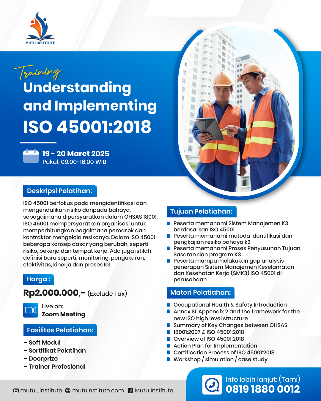 Ayo Ikuti Pelatihan Understanding & Implementing ISO 14001:20215 by Mutu Institute yang akan dilaksanakan pada :