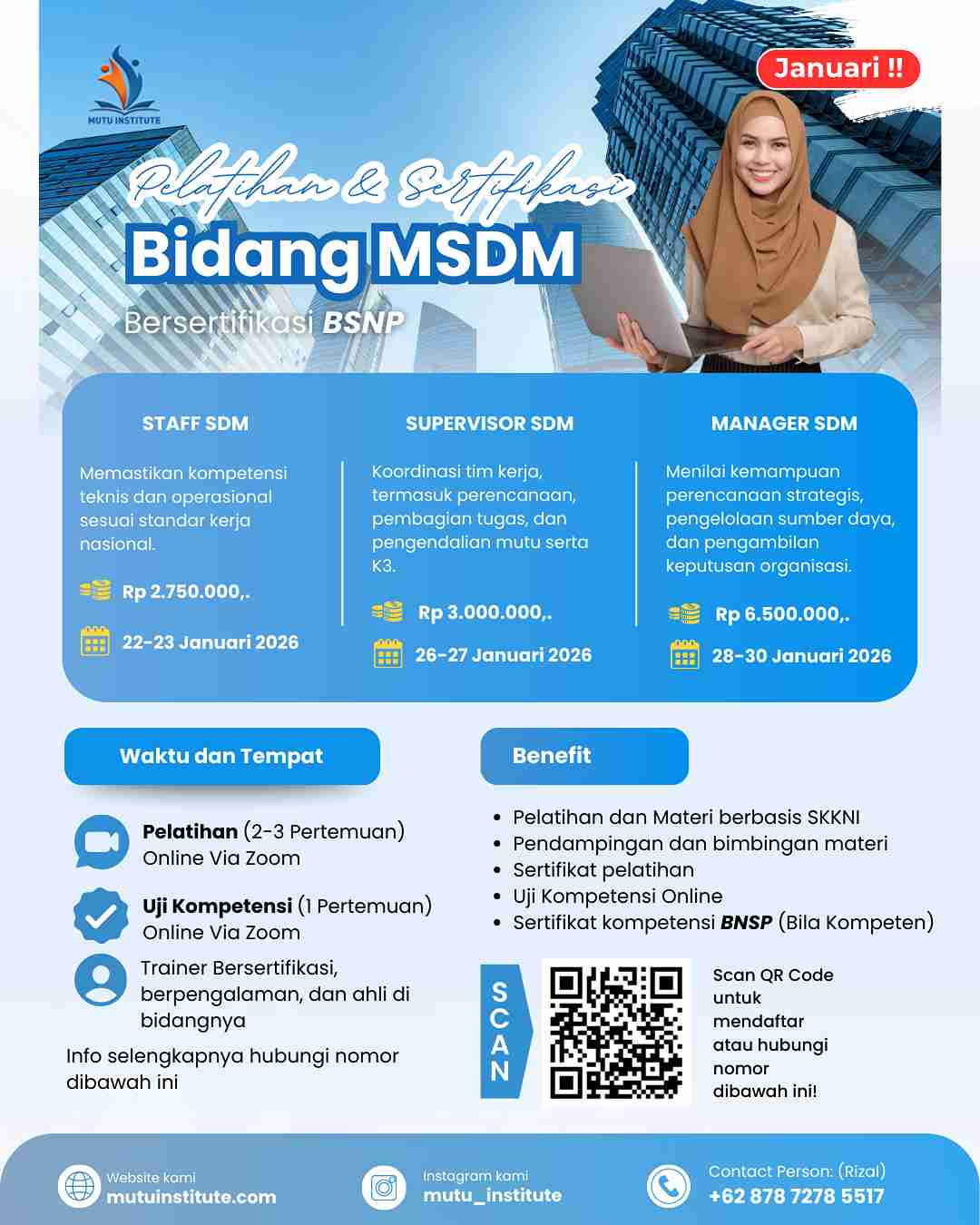 Sertifikasi MSDM BNSP di Mutu Institute adalah program validasi keahlian profesional bagi praktisi sumber daya manusia untuk mendapatkan pengakuan kompetensi resmi dari BNSP. Program ini dilaksanakan secara daring melalui Zoom Meeting dengan mencakup tiga skema utama: Staff SDM, Supervisor SDM, dan Manager SDM. Melalui pelatihan berbasis SKKNI ini, kami menjamin setiap peserta mendapatkan bimbingan intensif dari trainer berpengalaman agar siap menghadapi uji kompetensi dan memperkuat daya saing karier di level nasional.