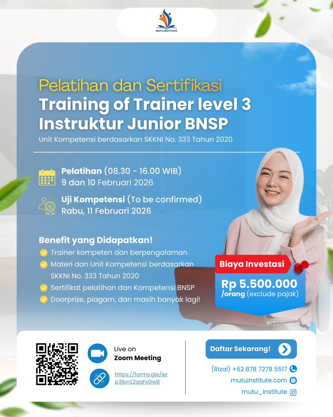 Pelatihan dan Sertifikasi Training of Trainer (ToT) Level 3 Instruktur Junior BNSP adalah program validasi resmi bagi calon trainer untuk menguasai kompetensi dasar mengajar berdasarkan standar SKKNI No. 333 Tahun 2020. Program ini dirancang oleh Mutu Institute untuk memastikan setiap instruktur memiliki kredibilitas dalam menyusun materi, mengelola kelas, hingga mengevaluasi hasil pembelajaran secara profesional. Batch terdekat akan dilaksanakan pada 9-10 Februari 2026 melalui platform Zoom Meeting.