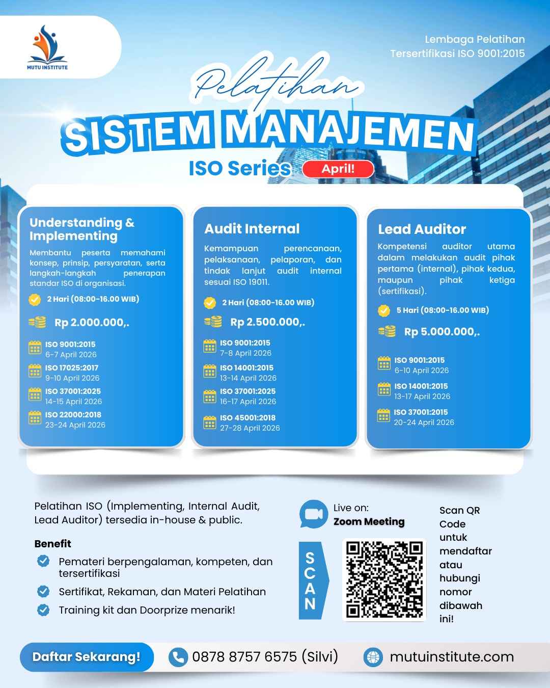 Mutu Institute, sebagai lembaga pelatihan tersertifikasi ISO 9001:2015, menyelenggarakan rangkaian program “ISO Series” sepanjang April 2026 untuk mencetak praktisi sistem manajemen yang andal.