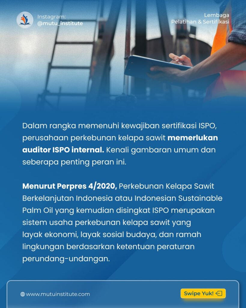 Dalam konteks ini, auditor ISPO internal memainkan peran kunci dalam memastikan bahwa perusahaan perkebunan kelapa sawit memenuhi semua persyaratan ISPO secara internal.