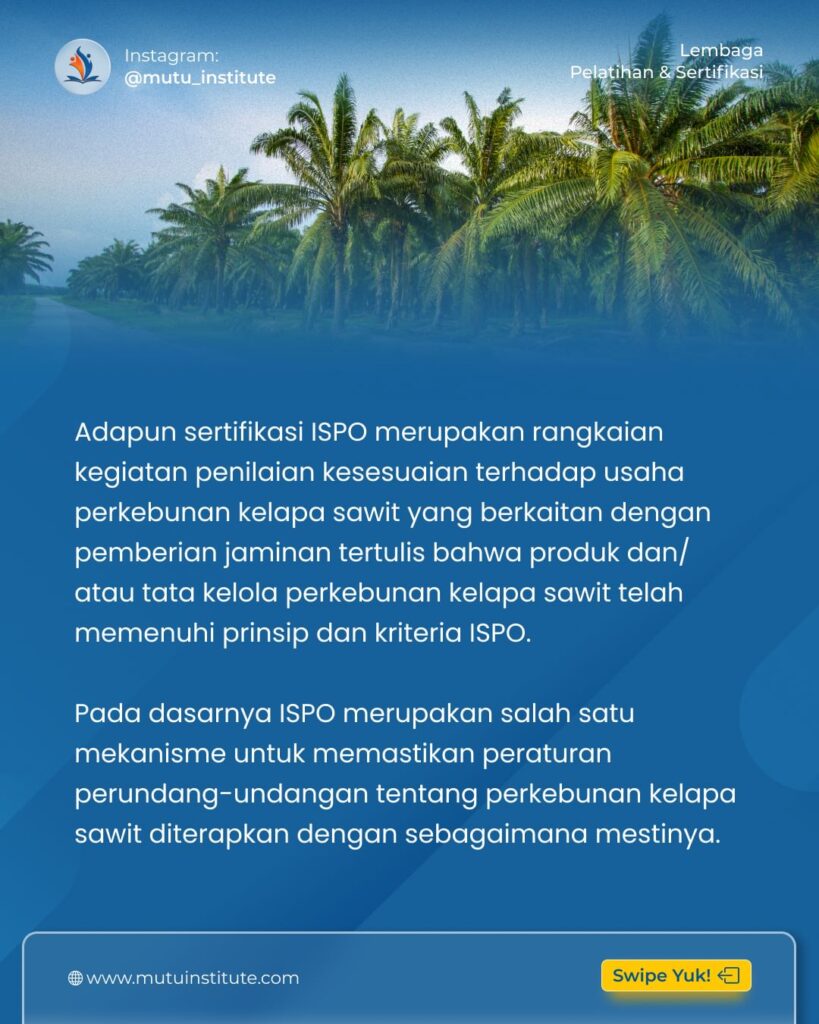 Adapun sertifikasi ISPO merupakan rangkaian kegiatan penilaian kesesuaian terhadap usaha perkebunan kelapa sawit yang berkaitan dengan pemberian jaminan tertulis bahwa produk dan/ atau tata kelola perkebunan kelapa sawit telah memenuhi prinsip dan kriteria ISPO.