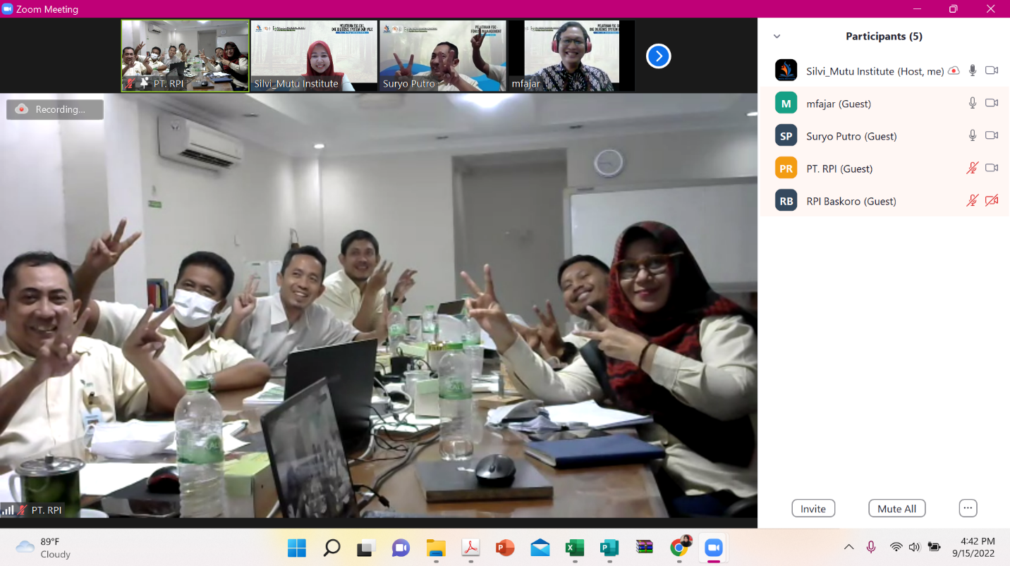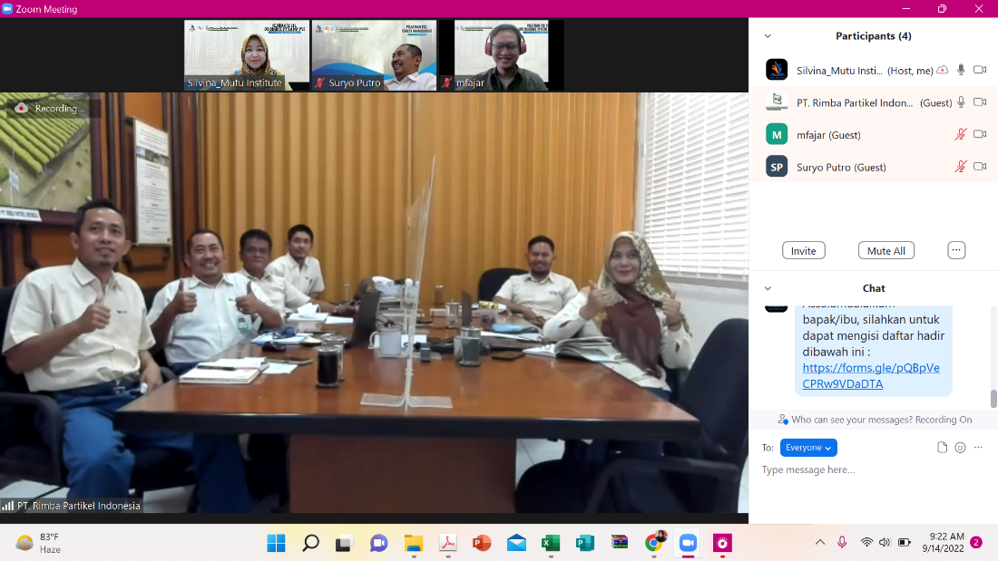 Kegiatan pelatihan ini dilaksanakan pada tanggal 14 – 16 September 2022 secara Online Zoom Meeting dan diikuti oleh 6 orang peserta pelatihan yang berasalah dari PT Rimba Partikel Indonesia. Diawali sambutan sekaligus pembukaan kegiatan pelatihan oleh Bapak Suryo Putro Adhilaksono selaku Chief QHSE & HRD-Personalia dan beliau berharap setelah mengikuti kegiatan pelatihan ini maka para peserta dapat lebih memahami lagi terkait dengan FSC COC, DDS dan SVLK di PT Rimba Partikel Indonesia dan mampu diimplementasikan di organisasi. Narasumber yang professional dan ahli di bidang FSC COC, DDS yaitu Bapak Muhammad Fajar dan materi SVLK disampaikan oleh bapak Ivan Sofyan. Kegiatan pelatihan dapat diserap dengan baik oleh para peserta dibuktikan dengan nilai Post Test yang jauh di atas nilai pre test sehingga terdapat perbedaan dan hasil yang significant. Lebih menarik lagi karena diskusi yang atraktif dan diskusi langsung terkait dengan fakta – fakta yang ditemui di organisasi.