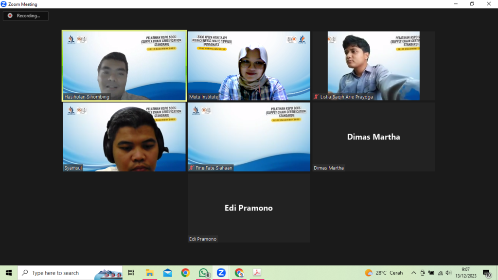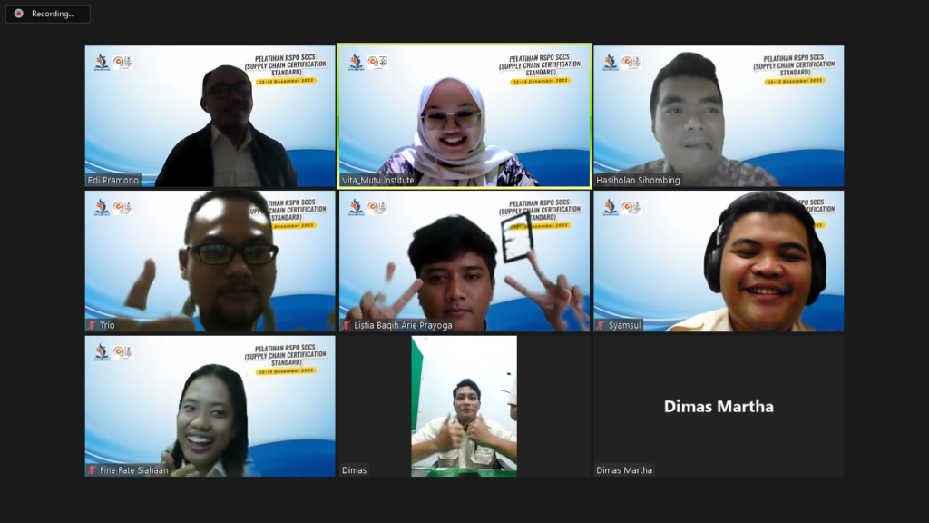Mutu Institute dengan antusiasme yang tinggi menyelenggarakan pelatihan publik terkait RSPO SCCS. Pelatihan ini ditujukan untuk perusahaan perkebunan kelapa sawit dari berbagai daerah di Indonesia. Pelatihan ini diselenggarakan selama 2 hari pada hari Selasa-Rabu, 12-13 Desember 2023 dengan menggandeng narasumber yang kompeten di bidangnya yakni Bapak Hasiholan Siahaan. Perusahaan-perusahaan yang berpartisipasi pada pelatihan ini yakni PT Austindo Nusantara Jaya Agri, PT Kayung Agro Lestari, PT Austindo Nusantara Jaya Agri Siais, PT Permata Putera Mandiri, PT Jumbo Megah Perkasa, dan juga PT Sahabat Mewah Makmur. Perusahaan tersebut merupakan perusahaan yang bergerak di bidang perkebunan kelapa sawit di Indonesia.